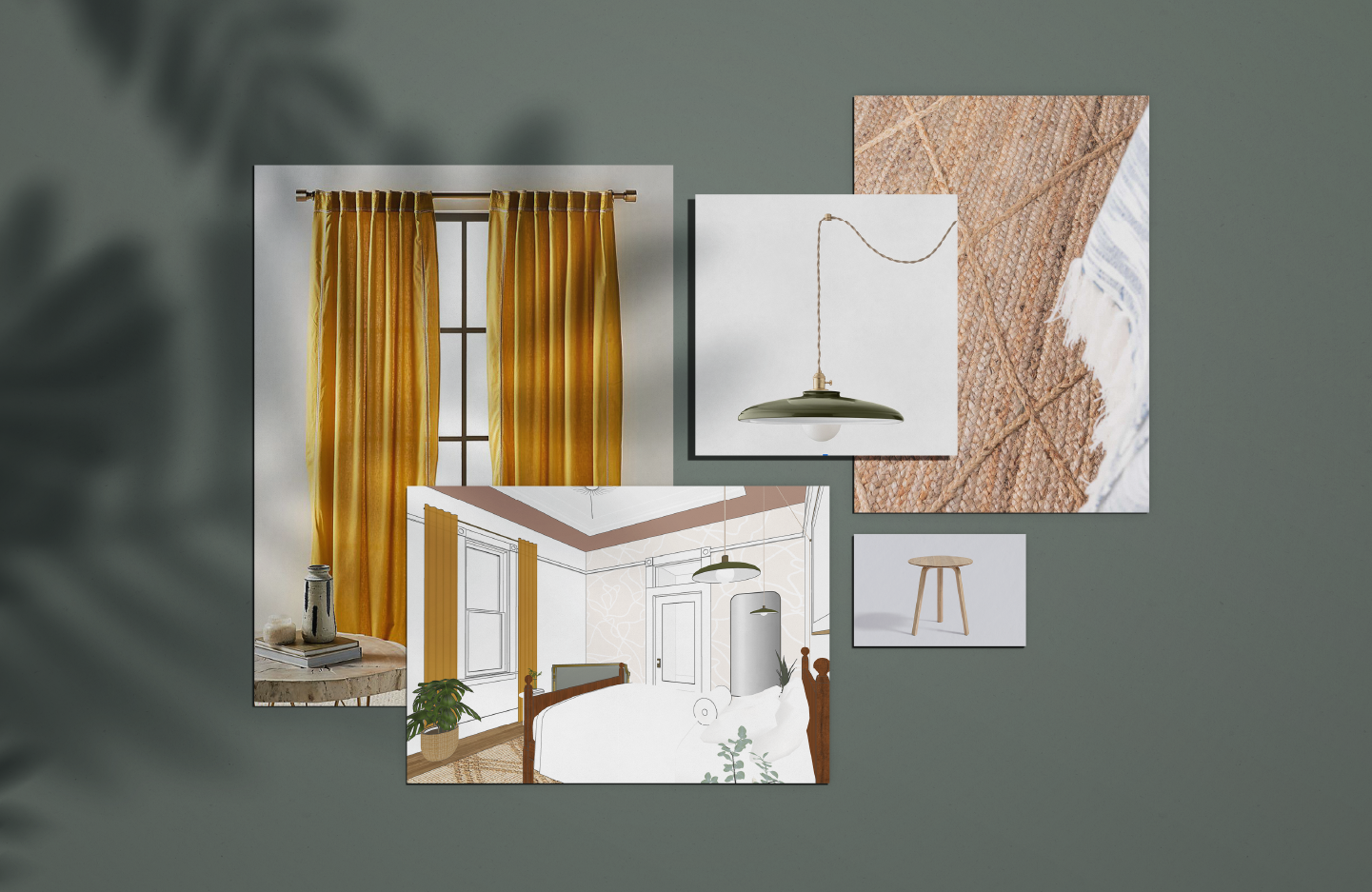 “Continuing the color theme, we love the combination in this room of these mustard curtains with bedside pendants suspended from the above. ”