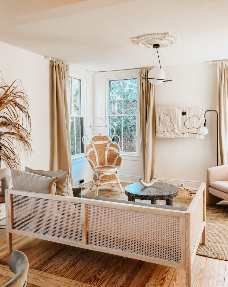Curtains Anthropologie Mara Curtains: $64.95 | Light Fixtures Schoolhouse Electric Apartment Plug-in Pendant & Metal Dish Shade: $218 | Area Rug Handknotted.com Braided Jute Rug: $369 | Nightstands HAY Bella Side Tables: $250.75