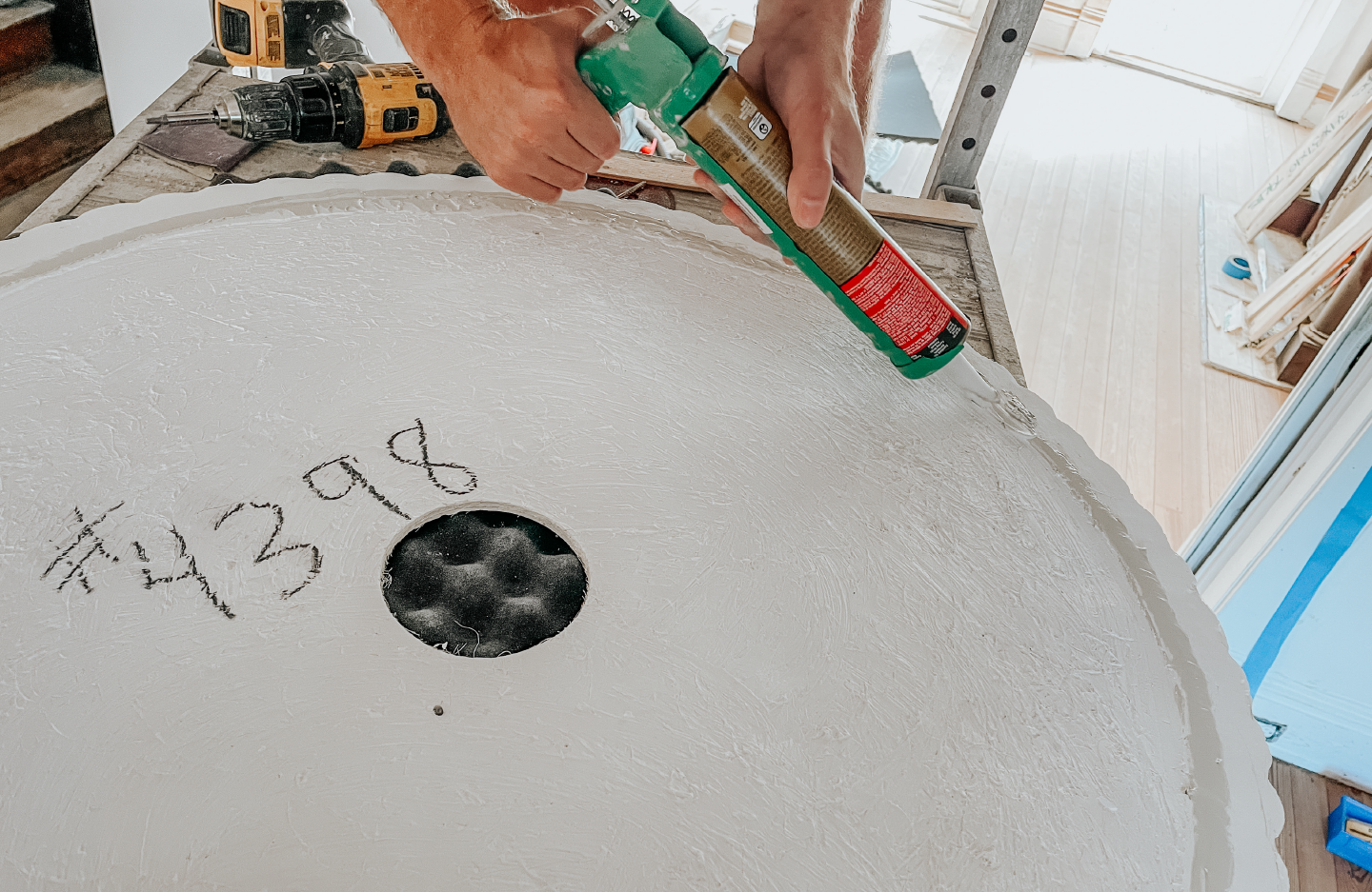 Also, working carefully and pre-drilling a countersink for the screws is essential. For a medallion as large as ours, it took two people to hold it up and screw, and using a rolling scaffold for that install was a huge help.